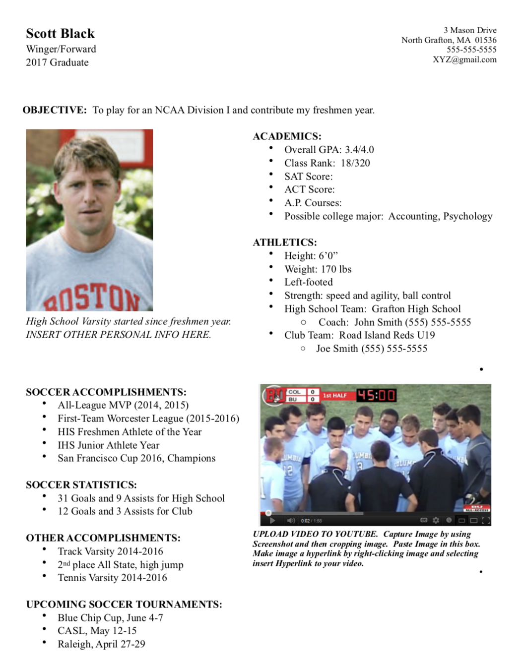 - Resumes are the key to showing coaches who you are on and off the pitch. This is the place for BRAGGING! Fill your resume with, GPA, grades, extracurricular activities, awards from school, volunteer hours, contact information, tournaments or showcases you’ve attended, upcoming soccer events, and medals of achievement you’ve gained in your soccer career. Above all, the best thing to obtain on a resume is RECOMMENDATIONS from past coaches or trainers, as well as their contact information. This piece of paper is sometimes all a coach gets to see. Like film, always attach your resume to any email you send to a school of interest.